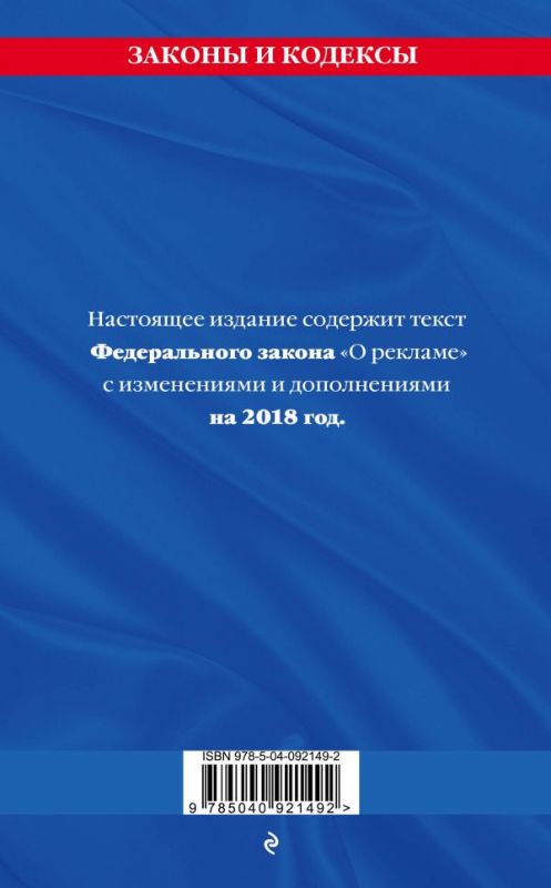 Настоящее издание содержит текст Федерального закона "О рекламе" с изменениями и дополнениями на 2018 год. Если есть изменения, вступающие в силу позднее, то вместе с редакцией нормы, действующей на эту дату, приводится норма в новой редакции и указывается дата, с которой она вступает в силу.