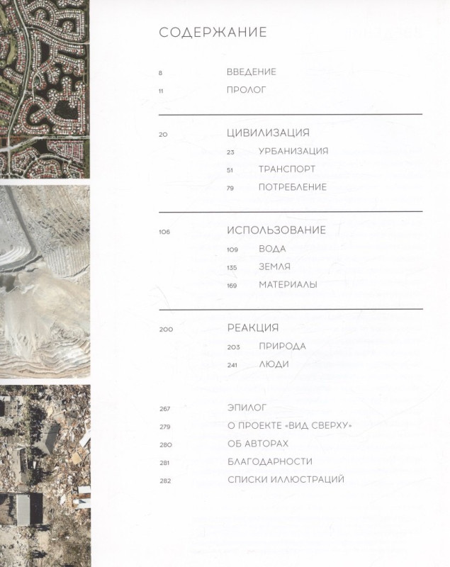 УДК 528.71:77.011 ББК 85.16 Г 77 Переводчик Ирина Окунькова Редактор Юлия Семенова Грант Б. Г 77. Вид сверху. Таймлапс : Как человек меняет Землю / Бенджамин Грант, Тимоти Догерти ; Пер. с англ. — М. : Альпина ПРО, 2023. — 284 с. ISBN 978-5-206-00024-5 «Вид сверху» — уникальный проект, который знакомит читателей с .эффектом обзора., предлагая им взглянуть на Землю с высоты и испытать чувства астронавтов, наблюдающих за планетой с космической станции. Данное издание продолжает разговор о красоте и хрупкости Земли, начатый в первой книге Б. Гранта — «Вид сверху: Потрясающие снимки Земли со спутников». Изображения, полученные при помощи спутников и аэрофотосъемки, показывают, как меняется наша планета под влиянием сил природы и масштабной человеческой деятельности, и не всегда это изменения в лучшую сторону. Авторы поднимают вопросы неизбежного нарастания экологических проблем: глобального потепления, уничтожения лесов, последствий чрезмерного потребления, загрязнения почвы, воздуха и воды. Многие фотографии выполнены методом «таймлапс» — представляют собой серии последовательных снимков с определенным интервалом между ними. Это позволяет отчетливо увидеть скорость изменений, происходящих в разных уголках мира, и осознать, что наша планета нуждается в заботе и защите. Только поняв меру личной ответственности каждого, мы сможем сохранить природные богатства и уникальный ландшафт своего общечеловеческого дома. Для широкого круга читателей.