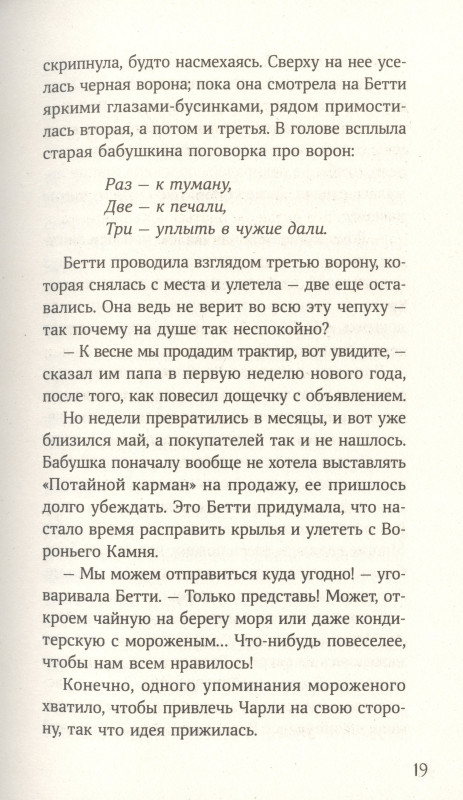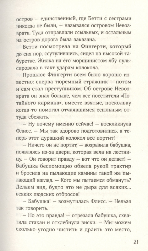 Удк 821.111 Ббк 83.3(4) Х21 Переводчик Екатерина Пташкина Редактор Мария Брауде Харрисон М. Х21 Горстка волшебства / Мишель Харрисон ; Пер. с англ. — М. : Альпина Паблишер, 2023. — 414 с. : ил. ISBN 978-5-9614-8596-7 Когда в «Потайном кармане» объявляется незваная гостья, сестры Уиддершинс—Бетти, Флисс и Чарли—оказываются по уши втянуты в очередное приключение. В нем замешаны таинственная карта, проклятый корабль, потерпевший крушение, и старинная легенда, которая может оказаться вовсе не легендой… Приготовься покинуть Вороний Камень и отправиться вместе с сестрами в неизведанное, прихватив с собой лишь горстку волшебства. Только берегись пиратов!