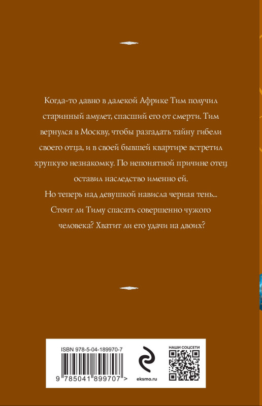 Татьяна Корсакова пишет на границе смешения жанров сентиментального романа, детектива и мистики. Почитатели любовно-авантюрных историй знают ее под псевдонимом Алиса Корсак. В ее романах есть всё: настоящая дружба, первая любовь, мистика, нетривиальный сюжет. Когда-то давно в далекой Африке Тим получил старинный амулет, спасший его от смерти. Тим вернулся в Москву, чтобы разгадать тайну гибели своего отца, и встретил в своей бывшей квартире хрупкую незнакомку, которой отец отчего-то оставил наследство. Теперь черная тень нависла над ней. Стоит ли Тиму спасать совершенно чужого человека? Хватит ли его удачи на двоих?