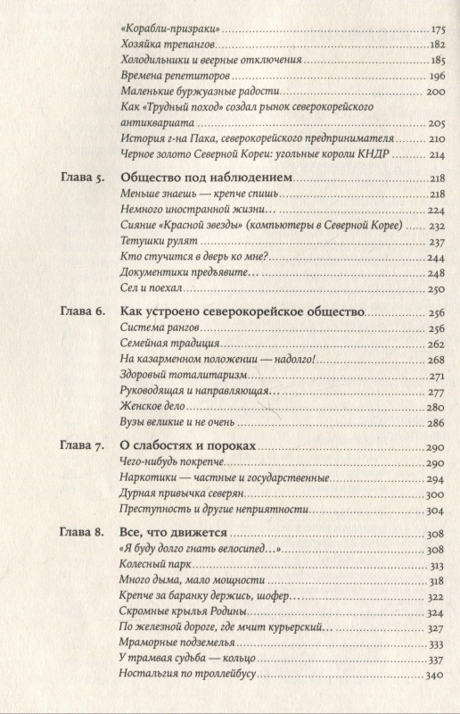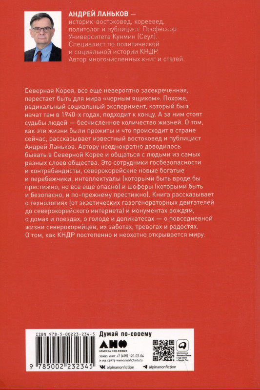 18+ НЕЗАКОННОЕ ПОТРЕБЛЕНИЕ НАРКОТИЧЕСКИХ СРЕДСТВ, ПСИХОТРОПНЫХ ВЕЩЕСТВ, ИХ АНАЛОГОВ ПРИЧИНЯЕТ ВРЕД ЗДОРОВЬЮ, ИХ НЕЗАКОННЫЙ ОБОРОТ ЗАПРЕЩЕН И ВЛЕЧЕТ УСТАНОВЛЕННУЮ ЗАКОНОДАТЕЛЬСТВОМ ОТВЕТСТВЕННОСТЬ Северная Корея, все еще невероятно засекреченная, перестает быть для мира «черным ящиком». Похоже, радикальный социальный эксперимент, который был начат там в 1940-х годах, подходит к концу. А за ним стоят судьбы людей — бесчисленное количество жизней. О том, как эти жизни были прожиты и что происходит в стране сейчас, рассказывает известный востоковед и публицист Андрей Ланьков. "Разрешения на частную поездку выдаются при наличии уважительной причины — похороны или свадьба близкого родственника, например, или по официальному приглашению. В стандартном разрешении на проезд указываются имя владельца, место работы, цель поездки, пункт назначения и срок действия документа." Автору неоднократно доводилось бывать в Северной Корее и общаться с людьми из самых разных слоев общества. Это сотрудники госбезопасности и контрабандисты, северокорейские новые богатые и перебежчики, интеллектуалы (которыми быть вроде бы престижно, но все еще опасно) и шоферы (которыми быть и безопасно, и по-прежнему престижно). Книга рассказывает о технологиях (от экзотических газогенераторных двигателей до северокорейского интернета) и монументах вождям, о домах и поездах, о голоде и деликатесах — о повседневной жизни северокорейцев, их заботах, тревогах и радостях. О том, как кндр постепенно и неохотно открывается миру.