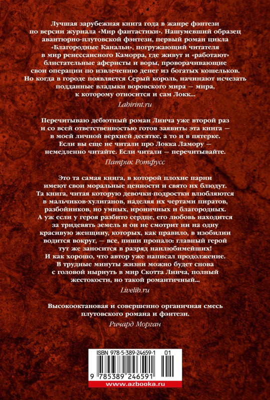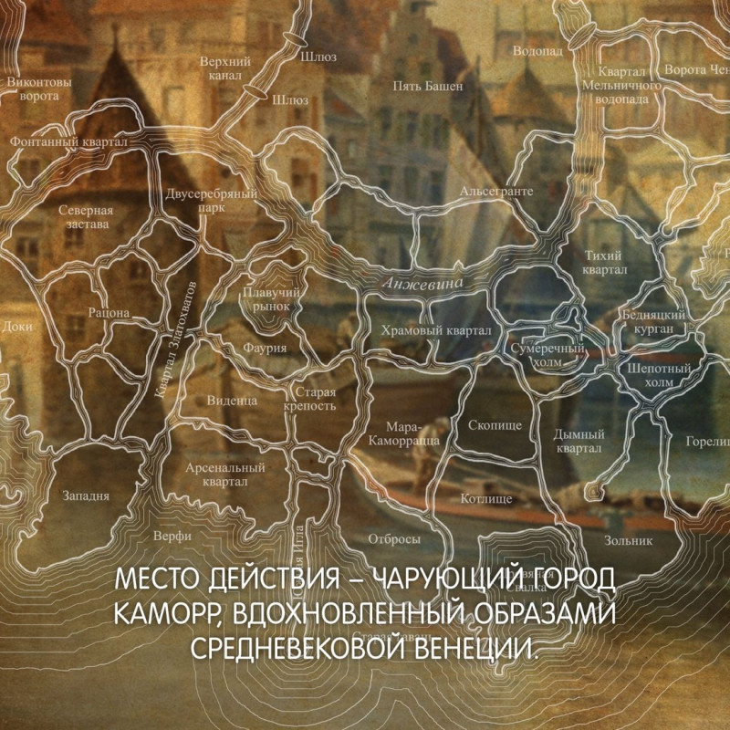 18+ НЕЗАКОННОЕ ПОТРЕБЛЕНИЕ НАРКОТИЧЕСКИХ СРЕДСТВ, ПСИХОТРОПНЫХ ВЕЩЕСТВ, ИХ АНАЛОГОВ ПРИЧИНЯЕТ ВРЕД ЗДОРОВЬЮ, ИХ НЕЗАКОННЫЙ ОБОРОТ ЗАПРЕЩЕН И ВЛЕЧЕТ УСТАНОВЛЕННУЮ ЗАКОНОДАТЕЛЬСТВОМ ОТВЕТСТВЕННОСТЬ «Свежо, оригинально, крайне занимательно — и великолепно исполнено» (Джордж Мартин). Однажды Воровской наставник явился к отцу Цеппи, Безглазому священнику храма Переландро, чтобы сбыть с рук несносного мальчишку Локка Ламору. Ведь Ламора, хоть и прирожденный вор, был воистину несносен, и для его исключительных талантов город-государство Каморр — прорезанное десятками каналов, раскинувшееся на множестве островов под сенью исполинских башен из стекла Древних — могло оказаться тесным. С течением лет Локку и его Благородным Канальям сходит с рук многое, вплоть до нарушения Тайного уговора, регулирующего всю жизнь Путных людей Каморра, но вот в закулисье преступного сообщества появляется Серый король — безжалостный, невидимый и неуязвимый убийца, — внося свои коррективы в очередную гениальную аферу Локка…