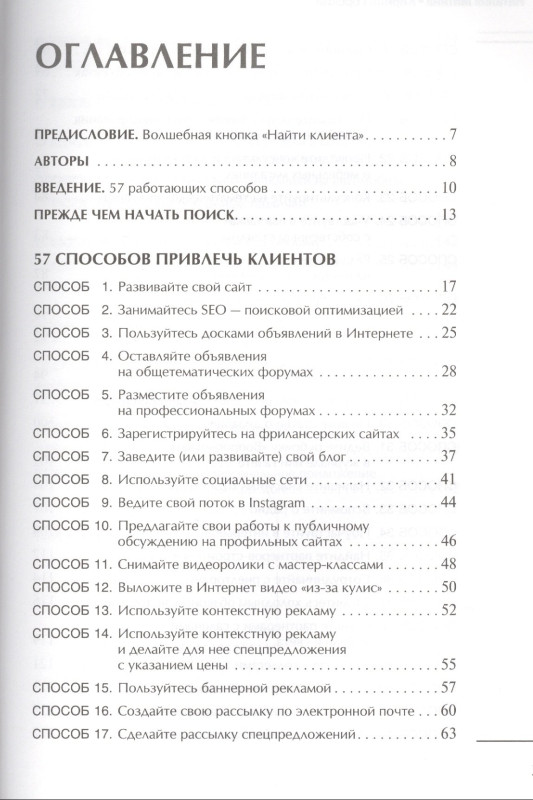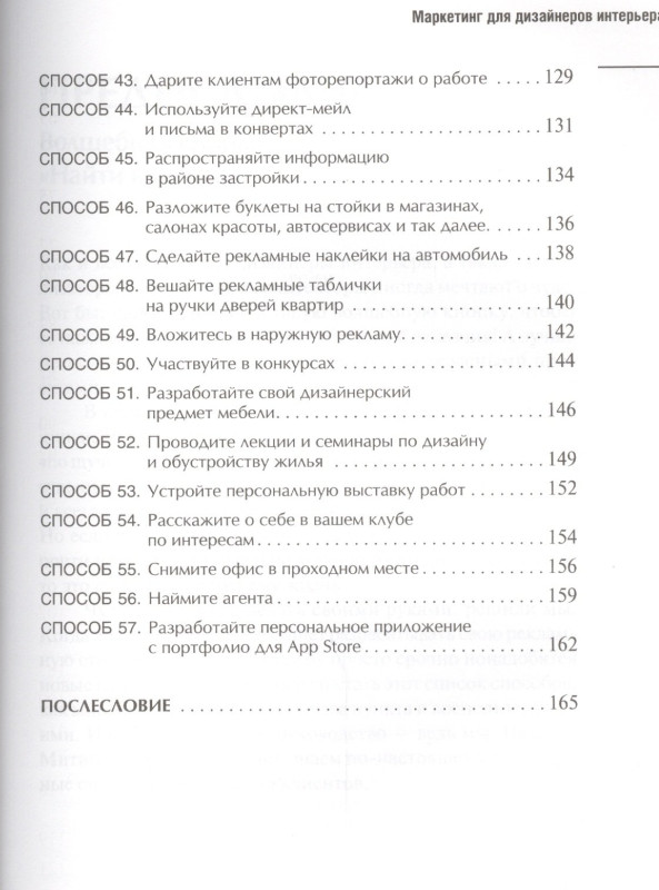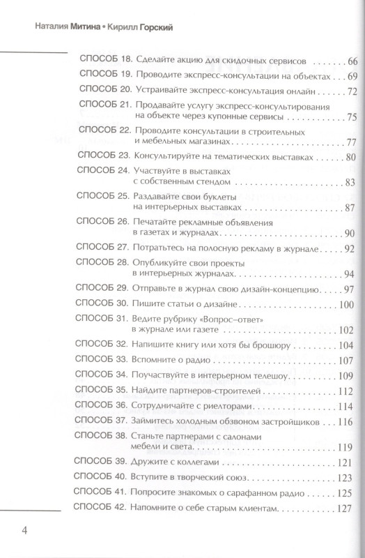 Что нужно для успешной работы в области дизайна интерьера? Как дизайнеру или визуализатору привести свое дело к процветанию? Получить блестящее образование, стать профессионалом, совершенствоваться — да, но этого недостаточно. Успешному бизнесу прежде всего нужен поток клиентов, ровный и постоянный. И как профессионализм требует упорной, продолжительной работы, так и поиск клиентов нельзя прекращать ни на секунду — даже когда в заказах нет недостатка и слава уже идет впереди вас. Привлечению клиентов не учат в российских школах интерьерного дизайна, но если раньше приходилось разыскивать советы, изучать подводные камни маркетинга по интернет-форумам и учиться скорее на своих ошибках, то теперь в этом больше нет необходимости. Наталия Митина и Кирилл Горский собрали в новой книге все известные им способы привлечения клиентов — все 57 — и дали им подробное описание. Используйте любой и используйте все, и поток заказчиков вам гарантирован.