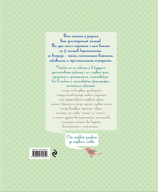 Нежный, трогательный альбом позволит сохранить самые ценные воспоминания о том, как малыш появился на свет, когда он впервые улыбнулся, когда прорезался первый зубик, какую сказку больше всего любил, какие игры играл и многое другое. Необыкновенные иллюстрации, ростомер, конверты для различных вложений, места для рисования, вклеивания фотографий и записи важных моментов, позволят не упустить из виду самые восхитительные мгновения в жизни.