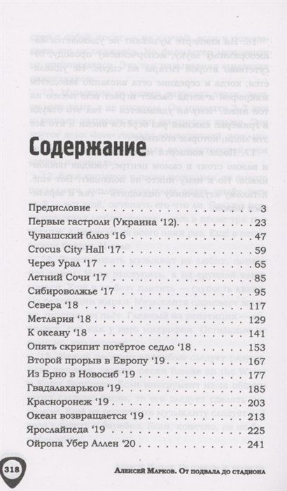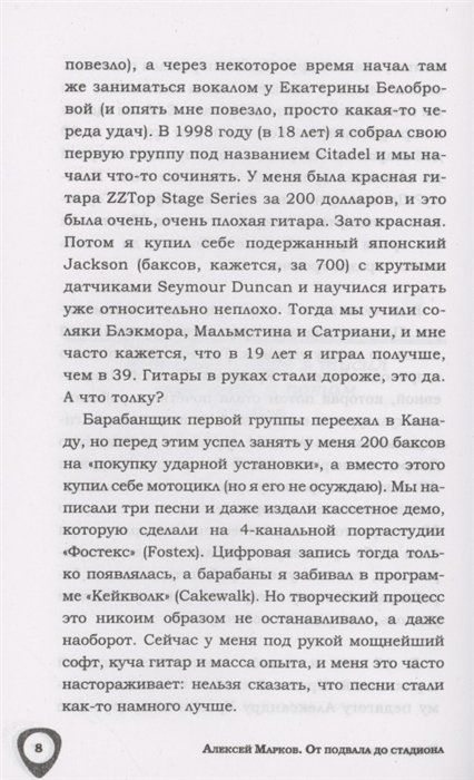 «От подвала до стадиона» — История успеха музыкальной группы, фронтмэном которой является Алексей Марков. Группа отжигает по всему миру от Сантьяго до Владивостока, сверхтехнично исполняя легендарный альбом Metallica 1999 года – «S&M» с симфоническим оркестром. Самый большой концерт – Arena Riga на 7000 зрителей. Автор делится лайфхаками как успешно отыграть концерт, чтобы зритель не просто был доволен, а реально угорел! Какие курьезы будут поджидать на гастролях и при переездах, как уместить, довезти и вытащить весь музыкальный инструмент из автобуса и при этом ничего не забыть. Не книга, а чек-лист для жаждущего славы музыканта!