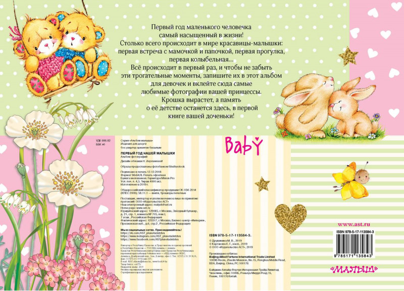 Первый год маленького человечка самый насыщенный в жизни! Столько всего происходит в мире красавицы-малышки: первая встреча с мамочкой и папочкой, первая прогулка, первая колыбельная... Всё происходит в первый раз, и чтобы не забыть эти трогательные моменты, запишите их в этот альбом для девочек и вклейте сюда самые любимые фотографии вашей принцессы. Кроха вырастет, а память о её детстве останется здесь, в первой книге вашей доченьки!