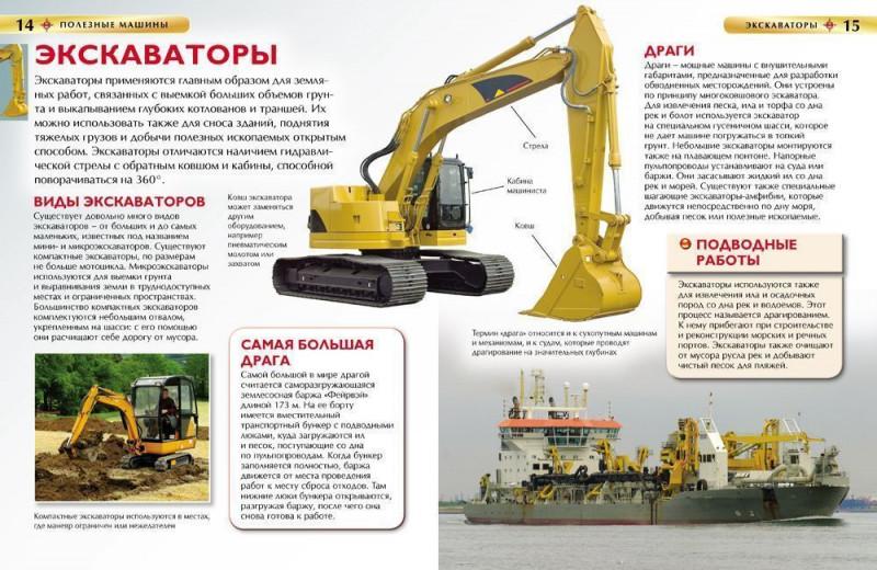 Человек придумал множество полезных машин, которые помогают ему во всех сферах жизни. Эта книга рассказывает о тех из них, с помощью которых можно строить любые, даже огромные, сооружения, копать ямы всех размеров и форм, передвигать груды грунта и камней, перевозить тяжелые грузы, поднимать их на невероятную высоту перекладывать с одного места на другое. Здесь говорится о машинах, которые могут выкачивать грунт со дна реки, валить деревья, удалять ветви и сучья, перевозить бревна, смешивать бетон, укладывать дороги, чистить снег и перерабатывать отходы. Все эти чудесные механизмы можно увидеть на красочных фотографиях, которыми проиллюстрирована книга.