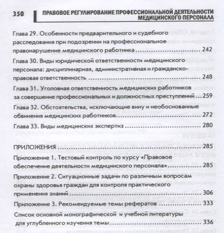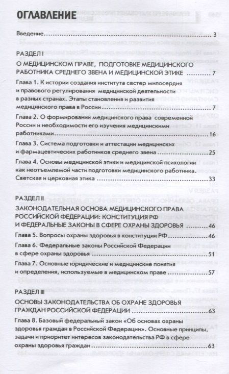 В учебном пособии, написанном в соответствии с учебной программой для средних медицинских образовательных учреждений, приводятся федеральные законы сферы охраны здоровья граждан в РФ, а также другие нормативные документы, регламентирующие медицинскую деятельность. Разъясняется особенность правового регулирования охраны здоровья разных групп населения и при разных видах медицинской деятельности; права граждан и пациентов в области охраны здоровья; права и обязанности медицинских организаций; права, социальная защита и ответственность медицинского работника за профессиональные и должностные правонарушения.