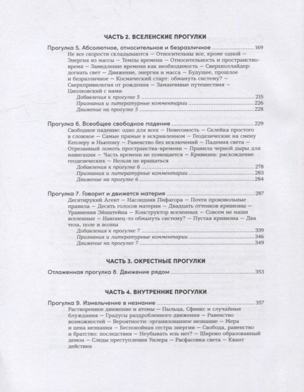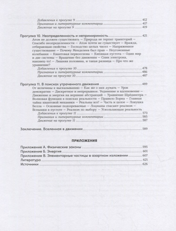 Эта книга — рассказ о фундаментальной научной картине мира в развитии от более наглядного к более абстрактному: от брошенного камня до объяснения уравнений Эйнштейна и Шрёдингера. Человек разбирается в устройстве Вселенной, наблюдая за движением, догадываясь о правилах, которые регулируют все, что происходит, и получая подсказки о скрытых частях мира или о новых правилах из несоответствий между ожидаемым и реальным движением: знаменитые примеры включают предсказанное существование Нептуна, Планеты 9 и невидимого вещества в галактиках, причины ускоренного расширения Вселенной, квантовую природу теплового излучения. В книге обсуждаются функционирование Солнечной системы и возможности путешествий по ней; взаимоотношения пространства, времени и движения в специальной теории относительности и определяемые ими проблемы галактических перелетов; общая теория относительности и ее эффекты, включая некеплеровы орбиты, замедление времени, гравитационные волны и экзотические способы сверхсветового перемещения; энтропия как незнание о микроскопическом движении и ее приложения от тепловых машин до демона Максвелла и черных дыр; квантовая механика, включая прохождение сквозь стены, уникальность устройства атомов, запутанность и интерпретации, призванные прояснить состояние кошки Шрёдингера. По правилам нашей Вселенной в ней невозможен покой, и читателю предстоит оценить ее беспокойное разнообразие.
