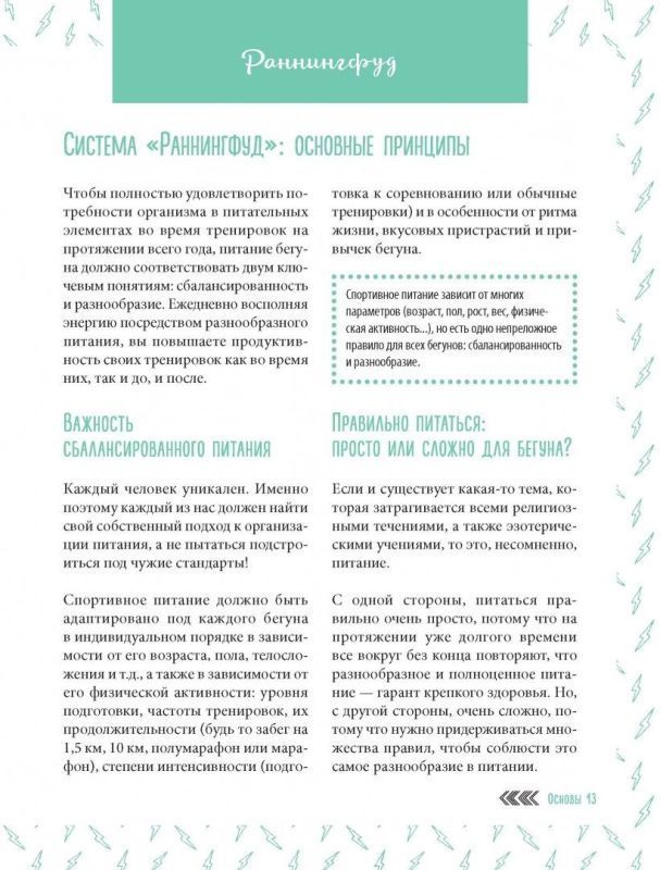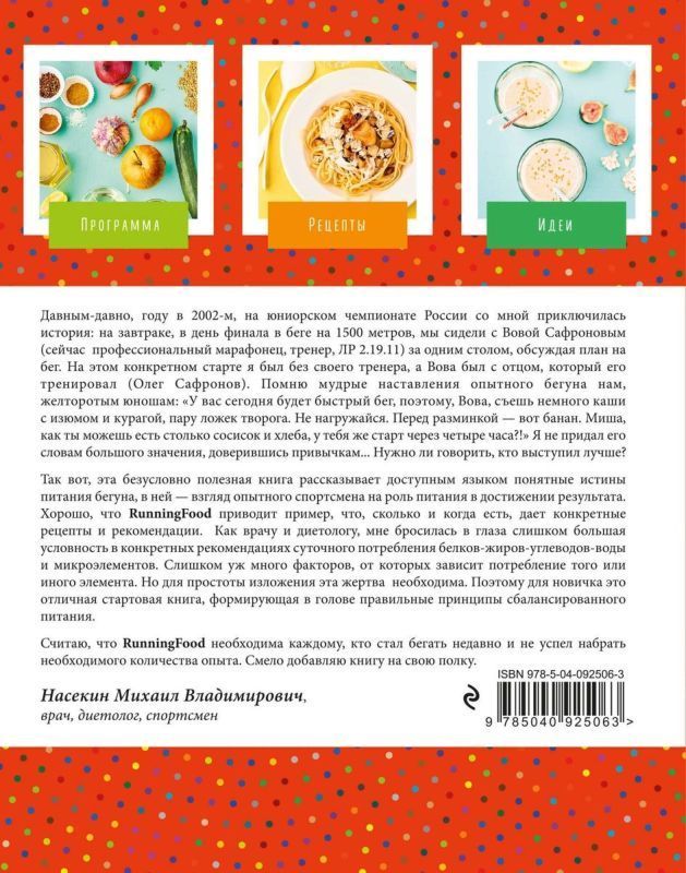 Для новичка - это отличная стартовая книга, формирующая в голове правильные принципы сбалансированного питания бегуна. Эта безусловно полезная книга рассказывает доступным языком понятные истины еды для бега, в ней - взгляд опытного спортсмена на роль питания в достижении результата. Хорошо, что RunningFood приводит примеры, что, сколько и когда есть, дает конкретные рецепты и рекомендации. У бегунов особые потребности в еде, и принцип "ем как все" не в силах ни удовлетворить эти потребности, ни восполнить энергетические затраты. Даже если хорошо сбалансированное питание само по себе не делает из вас победителя, оно, тем не менее, поддерживает продуктивность тренировок на высоком уровне и приближает вас к поставленным целям.