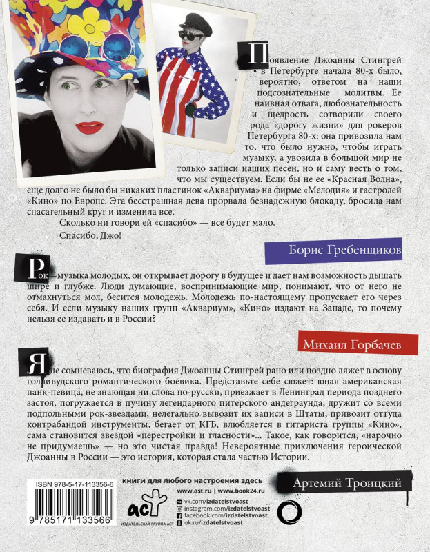 18+ НЕЗАКОННОЕ ПОТРЕБЛЕНИЕ НАРКОТИЧЕСКИХ СРЕДСТВ, ПСИХОТРОПНЫХ ВЕЩЕСТВ, ИХ АНАЛОГОВ ПРИЧИНЯЕТ ВРЕД ЗДОРОВЬЮ, ИХ НЕЗАКОННЫЙ ОБОРОТ ЗАПРЕЩЕН И ВЛЕЧЕТ УСТАНОВЛЕННУЮ ЗАКОНОДАТЕЛЬСТВОМ ОТВЕТСТВЕННОСТЬ Появление Джоанны Стингрей в Петербурге начала 80-х было, вероятно, ответом на наши подсознательные молитвы. Ее наивная отвага, любознательность и щедрость сотворили своего рода «дорогу жизни» для рокеров Петербурга 80-х: она привозила нам то, что было нужно, чтобы играть музыку, а увозила в большой мир не только записи наших песен, но и саму весть о том, что мы существуем. Если бы не ее «Красная Волна», еще долго не было бы никаких пластинок «Аквариума» на фирме «Мелодия» и гастролей «Кино» по Европе. Эта бесстрашная дева прорвала безнадежную блокаду, бросила нам спасательный круг и изменила все. Сколько ни говори ей «спасибо» — все будет мало._x000D_ Спасибо, Джо!_x000D_ Борис Гребенщиков_x000D_ Рок—музыка молодых, он открывает дорогу в будущее и дает нам возможность дышать шире и глубже. Люди думающие, воспринимающие мир, понимают, что от него не отмахнуться мол, бесится молодежь. Молодежь по-настоящему пропускает его через себя. И если музыку наших групп «Аквариум», «Кино» издают на Западе, то почему нельзя ее издавать и в России?_x000D_ Михаил Горбачев_x000D_ Я не сомневаюсь, что биография Джоанны Стингрей рано или поздно ляжет в основу голливудского романтического боевика. Представьте себе сюжет: юная американская панк-певица, не знающая ни слова по-русски, приезжает в Ленинград периода позднего застоя, погружается в пучину легендарного питерского андеграунда, дружит со всеми подпольными рок-звездами, нелегально вывозит их записи в Штаты, привозит оттуда контрабандой инструменты, бегает от КГБ, влюбляется в гитариста группы «Кино», сама становится звездой «перестройки и гласности»... Такое, как говорится, «нарочно_x000D_ не придумаешь» — но это чистая правда! Невероятные приключения героической Джоанны в России — это история, которая стала частью Истории._x000D_ Артемий Троицкий