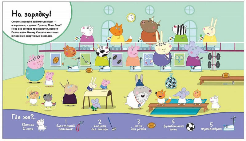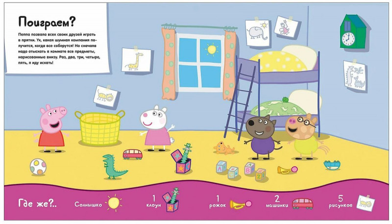 На страницах этой книжки ваш малыш сможет поиграть вместе с героиней любимого мультфильма! Ребенку будет интересно разглядывать рисунки в книге, где на каждой странице спрятаны предметы, которые нужно найти. Можно пофантазировать и сочинить историю о приключениях свинки Пеппы и ее друзей. Играя с красочной книжкой, ваш малыш будет развивать внимательность, зрительное восприятие и речь. Малыш прекрасно проведет время в компании очаровательной Свинки Пеппы.