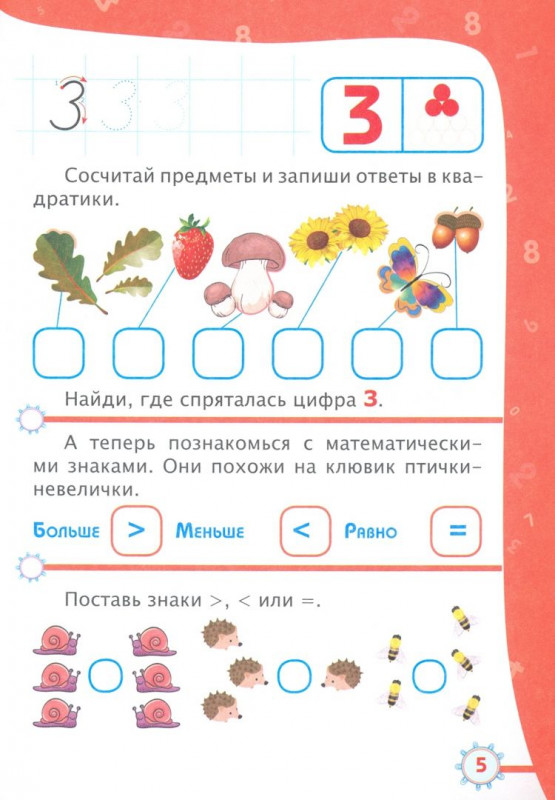 Разнообразные задания сборника помогут каждому ребенку от пяти лет познакомиться с цифрами, научиться их писать, соотносить цифру и число, которое она обозначает, сравнивать количество предметов, выполнять простейшие арифметические действия (сложение, вычитание). Также в сборнике предложены адаптированные для этого возраста задания, направленные на ознакомление с различными свойствами предметов: величина, положение в пространстве, цвет и форма, объем. Занятия по книге дадут малышу не только полезные знания и навыки, но и принесут удовольствие и радость. Адресовано родителям и детям для совместной деятельности, специалистам дошкольной педагогики.