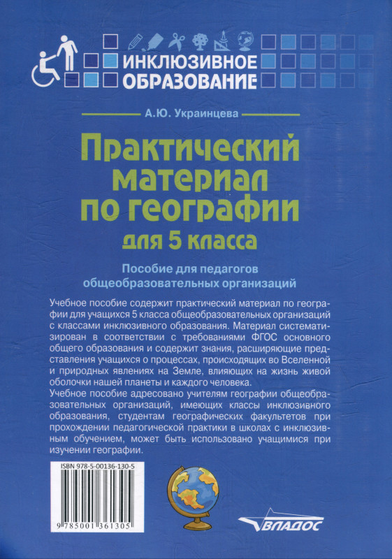 В учебное пособие включен практический материал по географии для учащихся 5 класса общеобразовательных учреждений с классами инклюзивного образования. Материал систематизирован в соответствии с требованиями ФГОС основного общего образования и содержит знания, расширяющие представления учащихся о процессах, происходящих во Вселенной и природных явлениях на Земле, влияющих на жизнь живой оболочки нашей планеты и каждого человека. В пособии содержатся дополнительные сведения о планетах Солнечной системы, об атмосфере, гидросфере, о горных породах, и полезных ископаемых, а также о географических исследованиях, открытиях, о путешественниках и мореплавателях и совершенных ими географических открытиях. Учебное пособие адресовано учителям географии общеобразовательных учебных организаций, имеющих классы инклюзивного образования, студентам географических факультетов при прохождении педагогической практики в школах с инклюзивным обучением, может быть использовано учащимися при изучении географии.