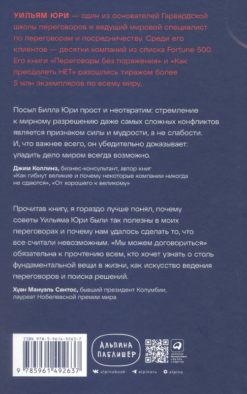 Переговорщик с 50-летним опытом и профессиональный посредник Уильям Юри в книге «Мы можем договориться» предлагает новый подход к переговорам, основанный на концепции поссибилизма — мышления, направленного на поиск возможностей даже в самых сложных ситуациях. Автор вводит три ключевые концепции: «выход на балкон», то есть отстранение от эмоций и обзор ситуации с более широкой перспективы, «построение золотого моста», что означает создание условий, при которых обе стороны могут найти взаимовыгодное решение, сохраняя лицо и избегая открытой конфронтации, а также «привлечение третьей стороны», когда участники не могут достичь соглашения самостоятельно. Овладев этим подходом, вы не только сможете разрешить текущие разногласия в бизнесе и личной жизни, но и научитесь принимать взвешенные решения и делать сложные переговоры конструктивными и результативными. предисловие Джима Коллинза ; перевод с английского Е. Лабатой-Тихоновой