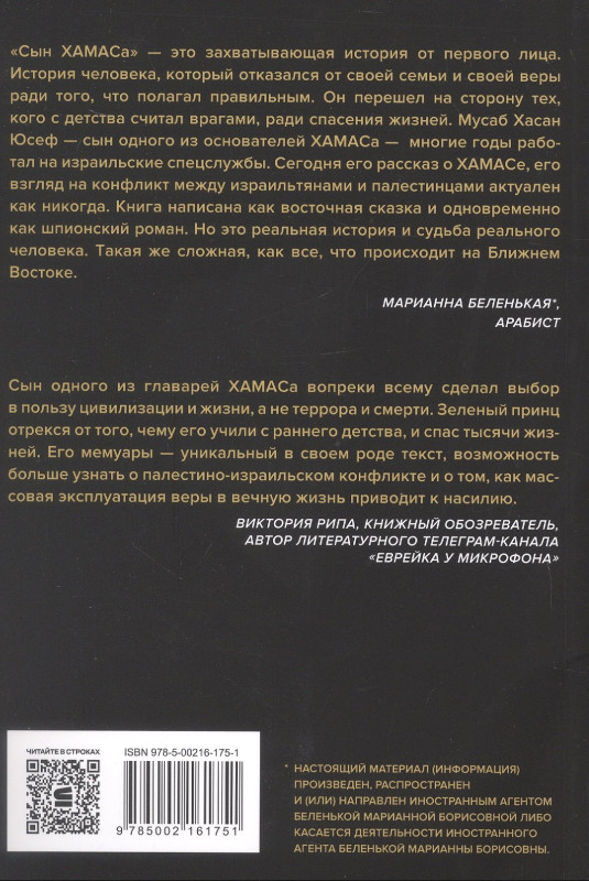 Зеленого принца (Мусаба Хасана Юсефа), сына одного из основателей и лидеров ХАМАСа, с детства учили ненавидеть. Но Мусаб не был прилежным учеником. И вместо ненависти и насилия он выбрал любовь и спасение. Более десяти лет Мусаб проработал на израильскую разведку Шин-Бет, предотвратил десятки терактов и спас сотни жизней. И хотя жизнь Мусаба напоминает сюжет шпионского триллера о двойном агенте, эта история гораздо глубже — о ежедневном выборе, с которым сталкивается человек. Где на одной чаше весов — семья и страна, а на другой — вера и принципы. Мусаб Хасан Юсеф и Рон Брэкин ; перевод с английского Максима Сороченко