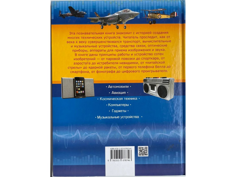 Эта познавательная книга знакомит с историей создания многих технических устройств. Читатель проследит, как от века к веку совершенствовался транспорт, вычислительные и музыкальные устройства, средства связи, оптические приборы, аппараты для приёма изображения и звука. В книге даны принципы работы и устройство сотен изобретений - от паровой повозки до спорткара, от аэростата до истребителя-невидимки, от «китайской стрелы» до ядерной ракеты, от первого телефона Белла до смартфона, от фонографа до цифрового проигрывателя.