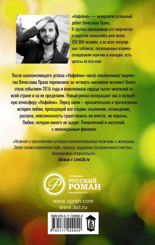 18+ НЕЗАКОННОЕ ПОТРЕБЛЕНИЕ НАРКОТИЧЕСКИХ СРЕДСТВ, ПСИХОТРОПНЫХ ВЕЩЕСТВ, ИХ АНАЛОГОВ ПРИЧИНЯЕТ ВРЕД ЗДОРОВЬЮ, ИХ НЕЗАКОННЫЙ ОБОРОТ ЗАПРЕЩЕН И ВЛЕЧЕТ УСТАНОВЛЕННУЮ ЗАКОНОДАТЕЛЬСТВОМ ОТВЕТСТВЕННОСТЬ Вячеслав Прах, буквально взорвавший Сеть своим романом «Кофейня», выпустил долгожданное продолжение нашумевшей истории. И это продолжение имеет все шансы быть растасканным на цитаты, как это случилось с его первым романом. Ведь здесь с необычайной выразительной силой показаны все цвета, которые составляют палитру любви, от восторга до отчаяния. Главный герой теряет сперва дочь, а затем возлюбленную. Теперь ему остается лишь вновь и вновь прокручивать, словно старую кинопленку, свои воспоминания, пытаясь найти ответ, кто же тот загадочный убийца, который сломал его жизнь. Но за детективной канвой с неожиданным и трагическим финалом скрывается на самом деле удивительная, трогательная и лиричная история любви. Прах создает воздушный, наполненный призраками и миражами мир двух возлюбленных, мир, где любовь находится на самом кончике пальцев, а прикосновения могут таить в себе как великое блаженство, так и неминуемую гибель. Это роман для тех, кто хочет разобраться в природе чувств...