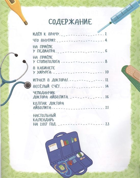 Серия «Игровая книжка малыша» порадует вас и ваших деток множеством ярких наклеек, игровых заданий, а также наличием поделок для творчества. Книга «Мой поход к врачу» научит ребёнка не бояться врачей и заботиться о своём здоровье. Смастерите чемоданчик доктора Айболита, склейте медицинский колпак и играйте в доктора!